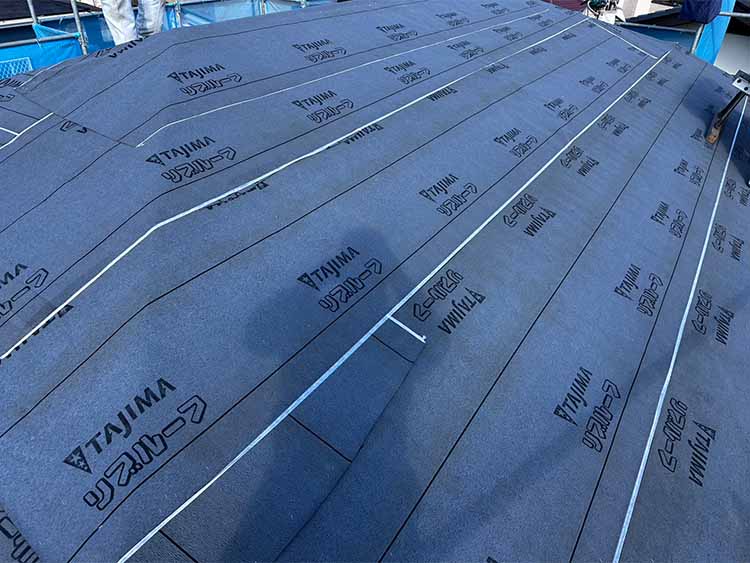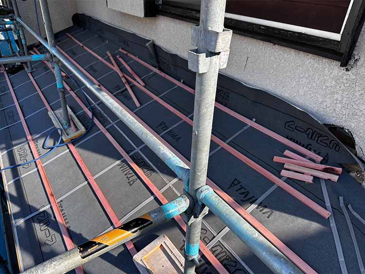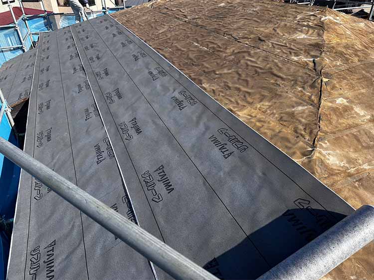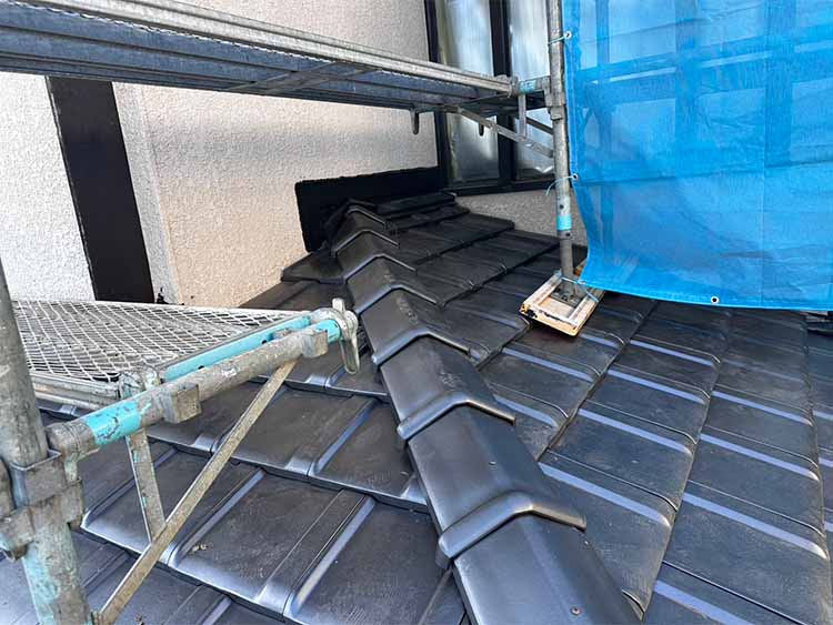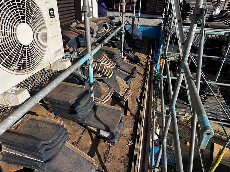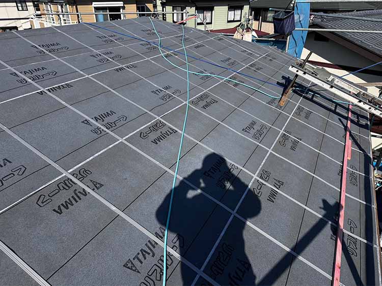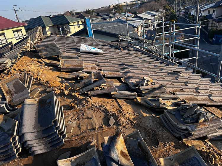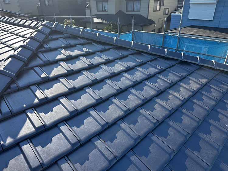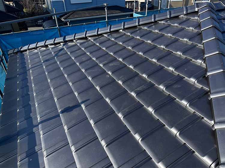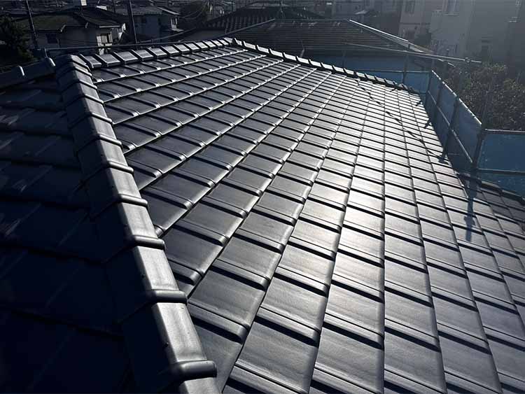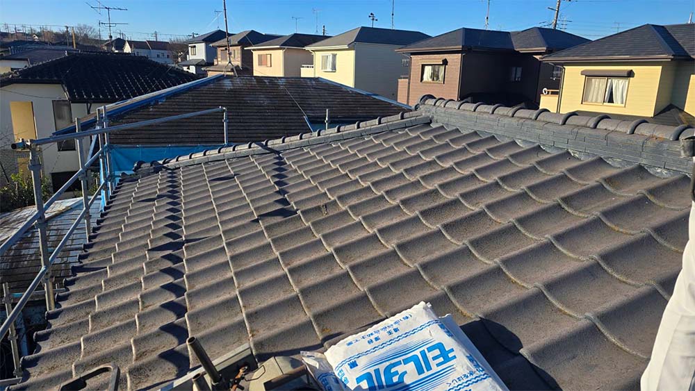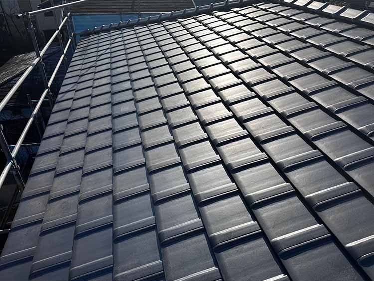 経年劣化した既存のセメント瓦をすべて撤去し、下葺き材(ルーフィング)から新しく施工したうえで、平板瓦(陶器瓦)へ葺き替えを行っています。